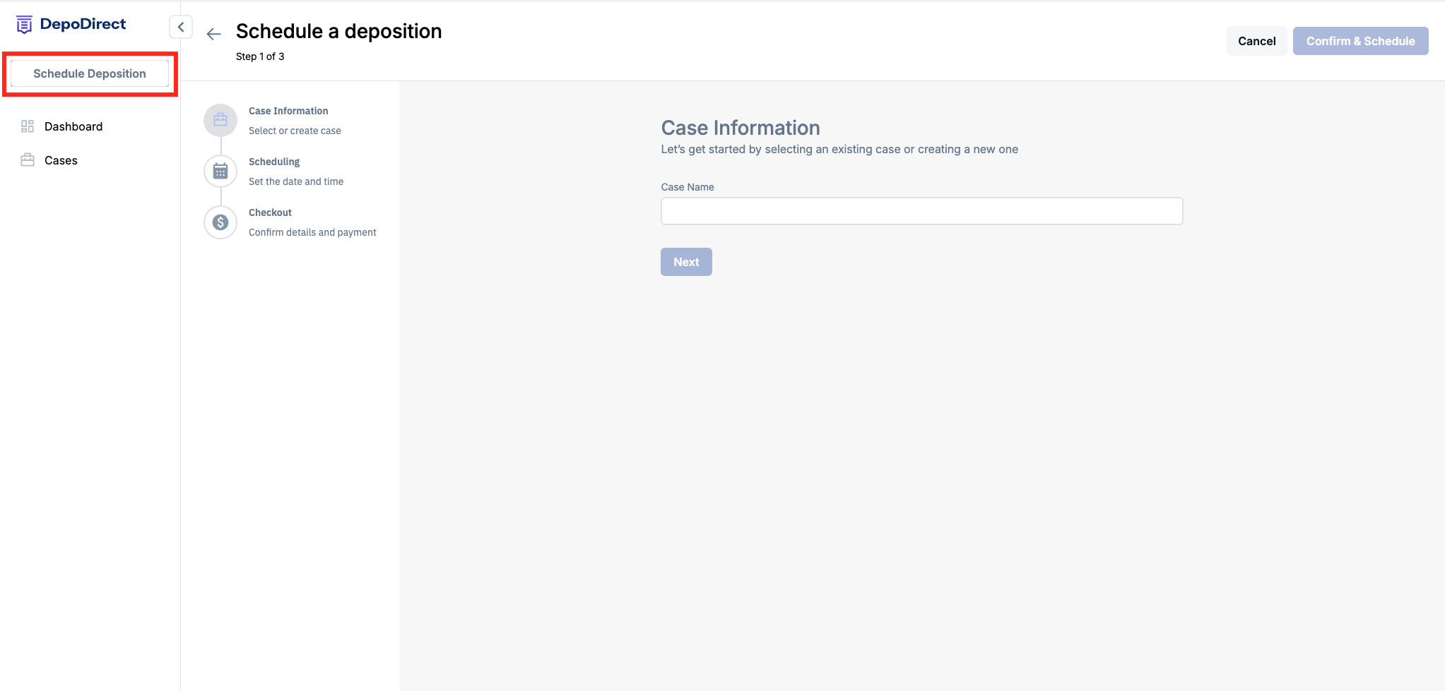 There are two ways to create a Case in DepoDirect. The first is to create just the case from the Navigation by clicking on the "Case" button. The second is to create a Case while scheduling the first Deposition for that case.