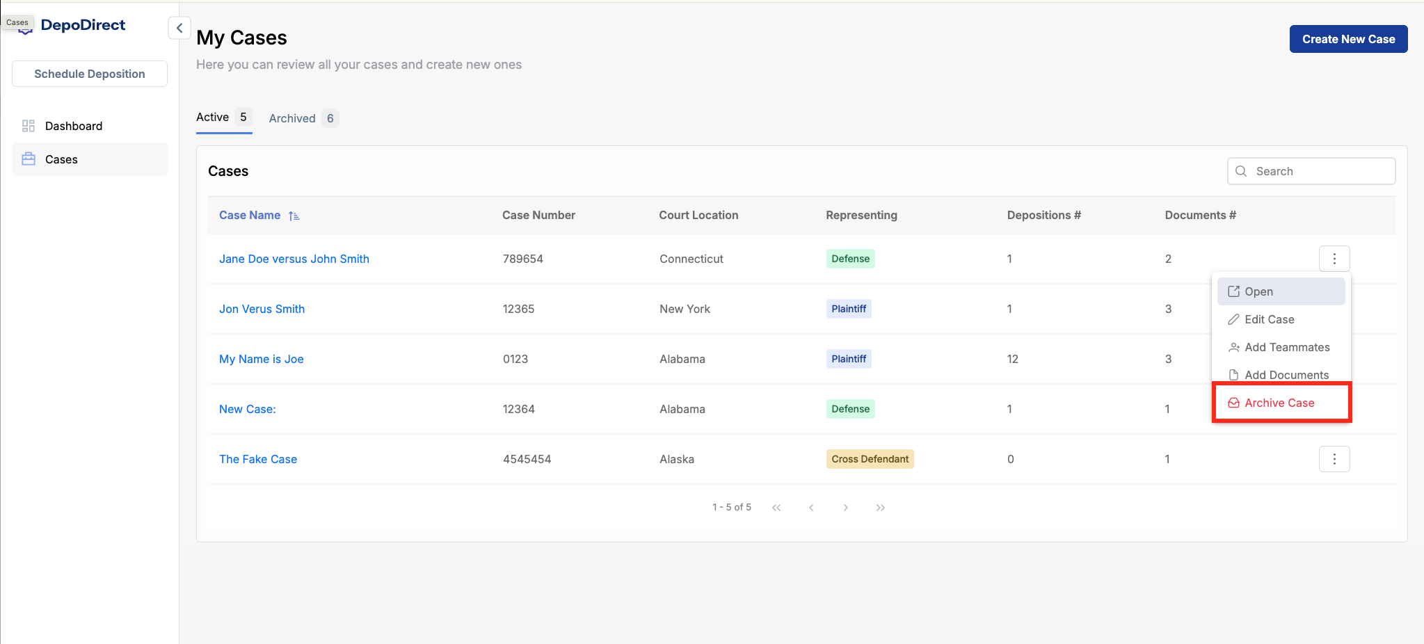 DepoDirect offers an archive function for Cases to keep your Case list limited to the Cases that need your attention. Archiving should be used when a Case is settled or otherwise resolved.